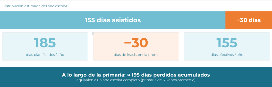 El impacto se acumula a lo largo de la trayectoria escolar: si ese nivel de inasistencias se mantiene durante toda la primaria -6 o 7 años, según la jurisdicción-, los alumnos pierden aproximadamente 195 días de clase, es decir, el equivalente a un año completo.