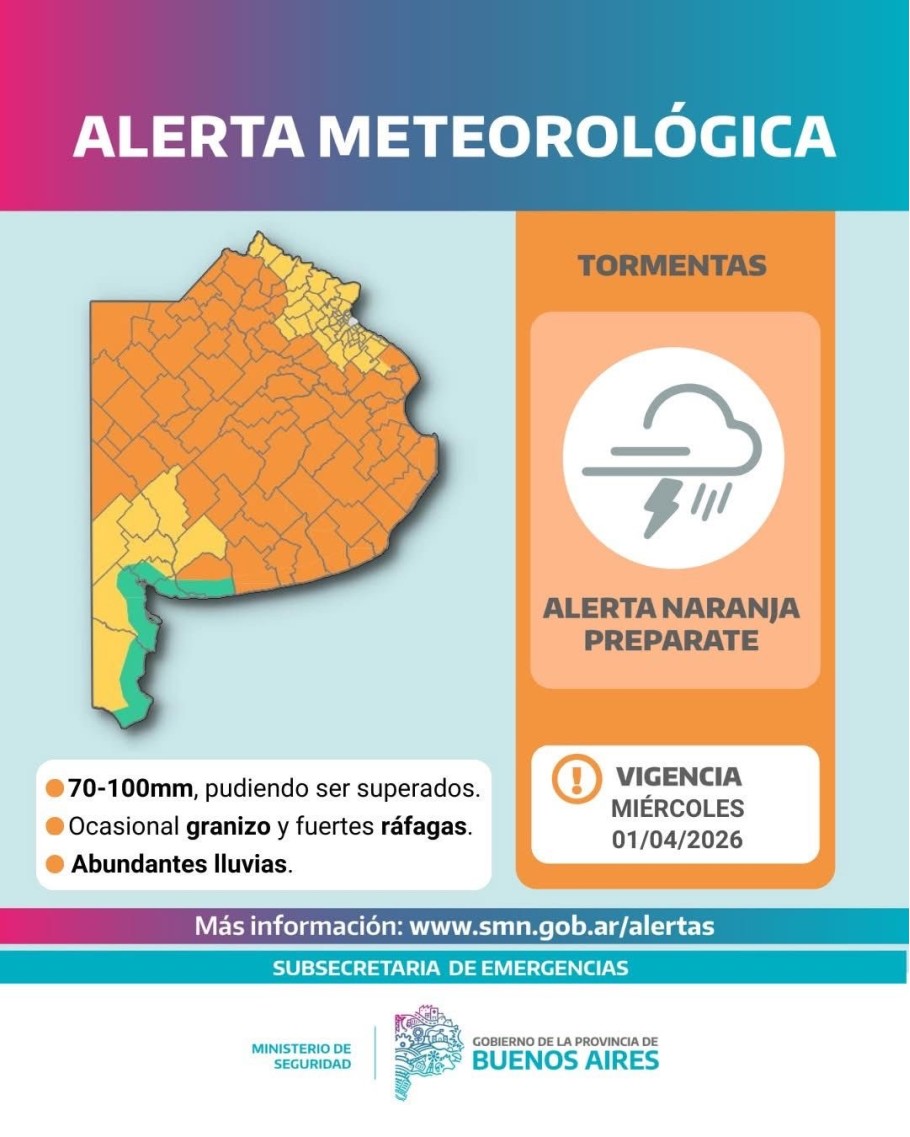 El Servicio Meteorológico Nacional emitió un alerta naranja por tormentas que afectará a General Alvear y gran parte de la provincia de Buenos Aires durante este miércoles 1° de abril. Se prevé que algunos de los fenómenos puedan alcanzar intensidad fuerte o localmente severa.
