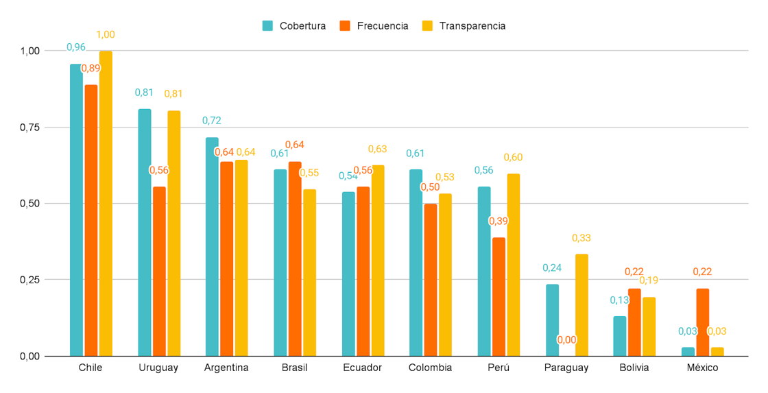 Cada una de estas dimensiones se evalúa según tres criterios: cobertura, frecuencia de actualización y transparencia en la publicación de la información. La fórmula utiliza una escala que va de 0 (ausencia total de información) a 1 (máximo nivel de apertura). El índice es un promedio de nueve variables (las tres dimensiones cruzadas con los tres componentes).