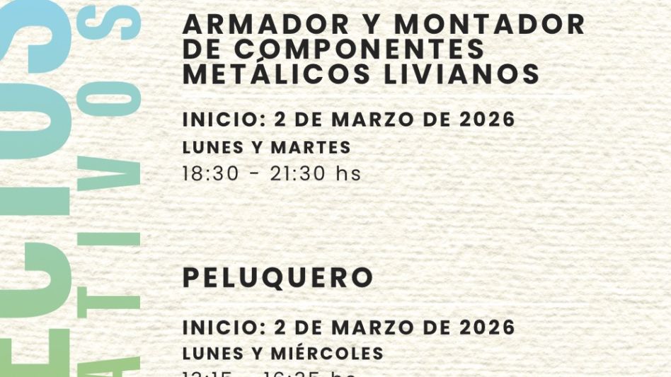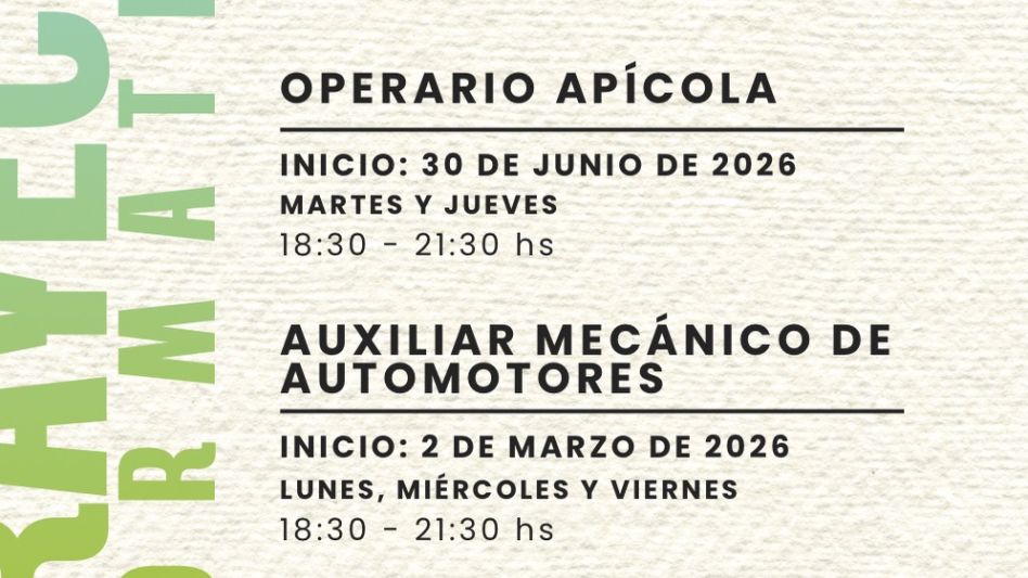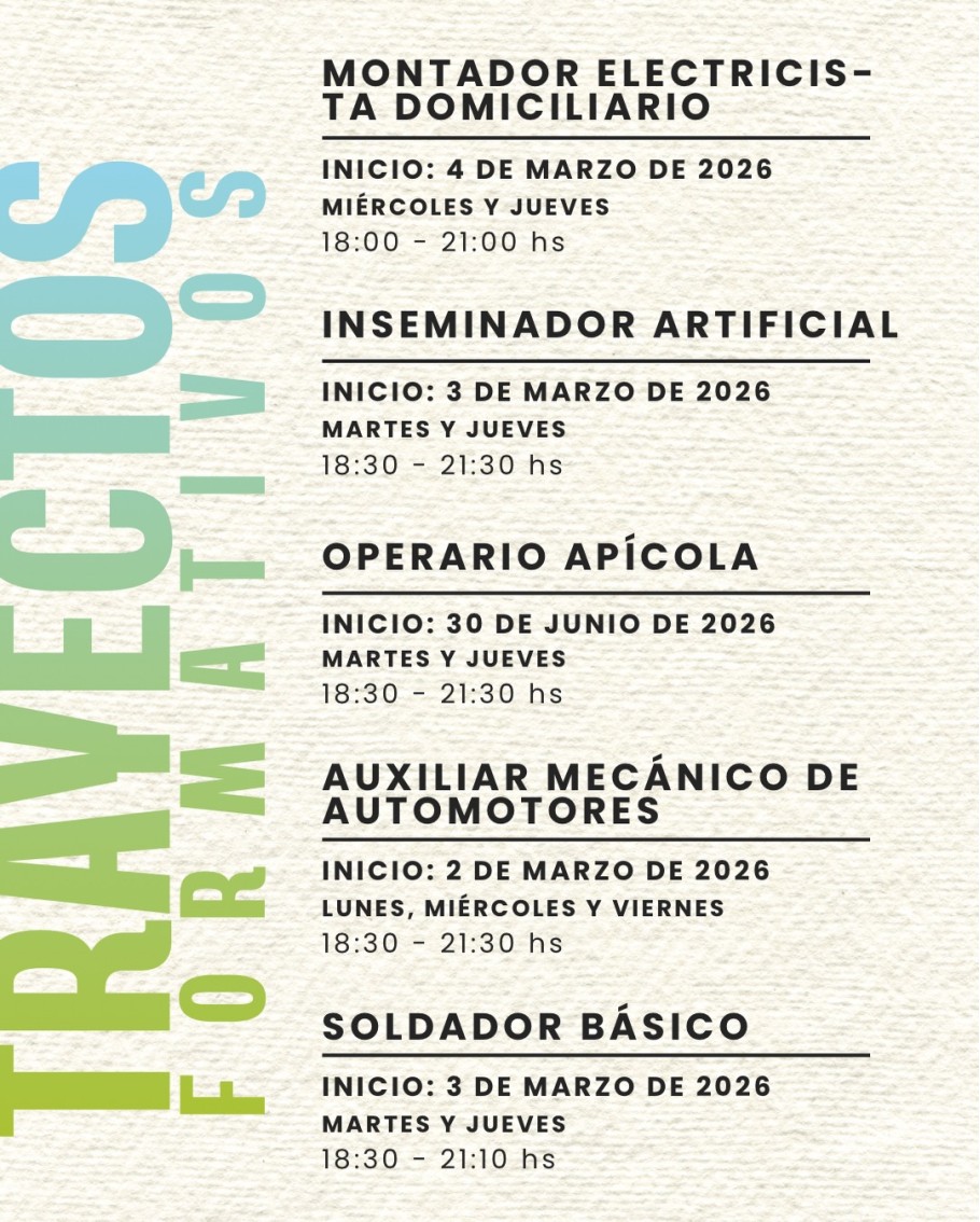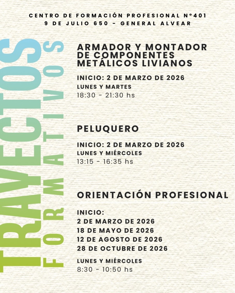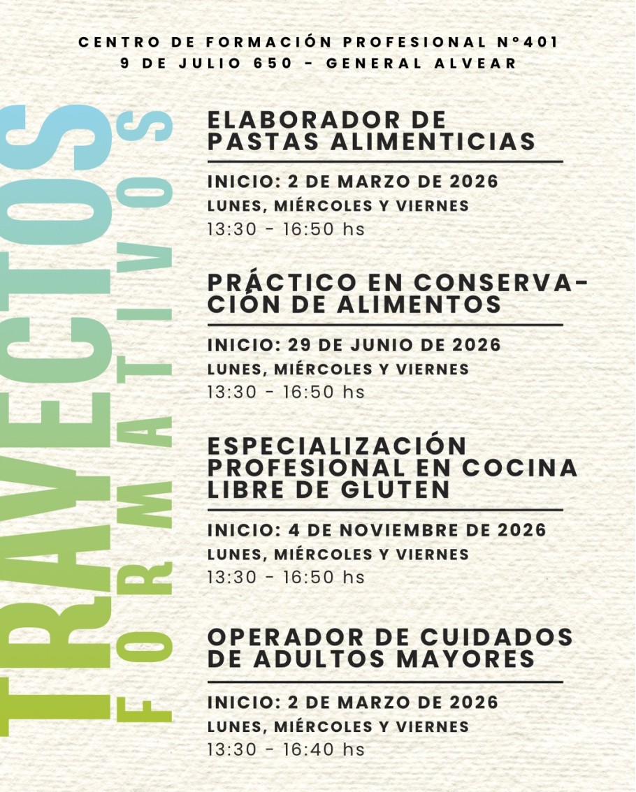 El Centro de Formación Profesional nos invita a inscribirnos en los trayectos formativos del 2026. Para pre inscribirte podes ingresar en este link: https://forms.gle/q6cKYwAJ7jaWNHkT7 y para más consultas te podes acercar a 9 de Julio 650.