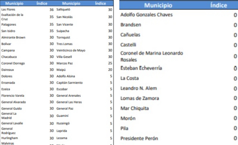 En este marco, es de destacar la fuerte mejora entre el informe pasado y este de cuatro distritos: La Plata, que pasó de 0 a 100 puntos; José C. Paz, que pasó de 5 a 100; Azul, que pasó de 30 a 100; y Moreno, que pasó de 35 a 100. Asimismo, otras 31 comunas también optimizaron su desempeño.