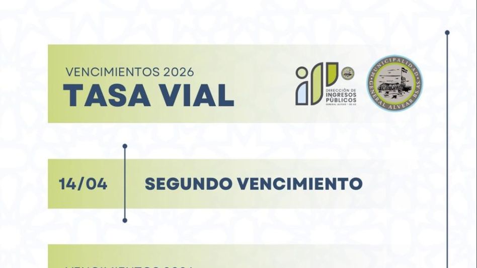 La Municipalidad de General Alvear informó que el próximo 14 de abril vence la Tasa Vial y la Tasa SUM, en lo que corresponde al segundo vencimiento de ambas obligaciones.