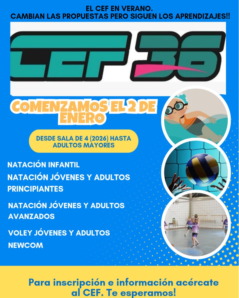 Natación infantil, Natación jóvenes y adultos principiantes, Natación jóvenes y adultos avanzados, Voley jóvenes y adultos, Newcom. Para información e inscripción, acércate al CEF 36