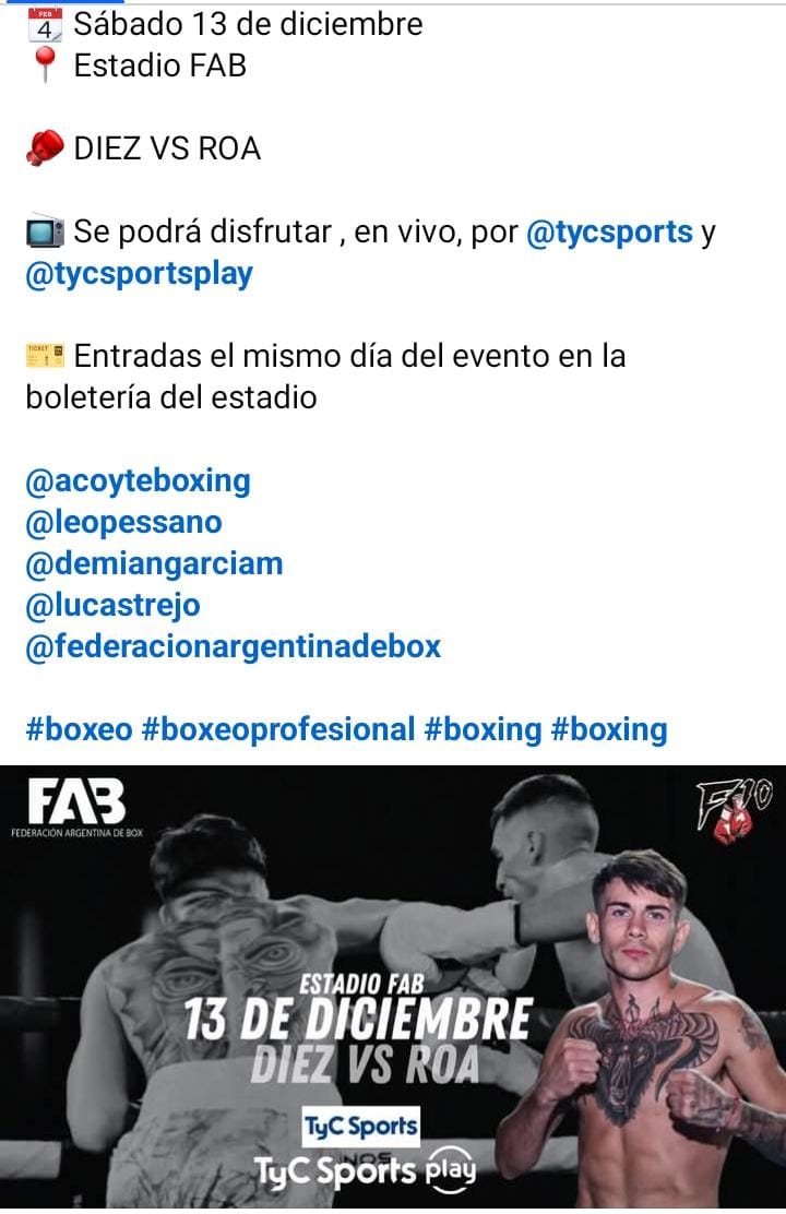 El sábado 13 de diciembre en la federación Argentina de Boxeo ante Roa. La pelea se podrá ver por TyCSpórts y por TyCSports play
