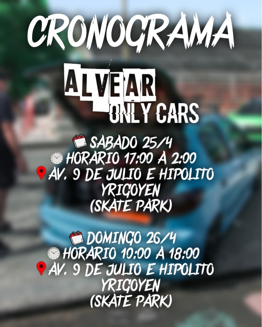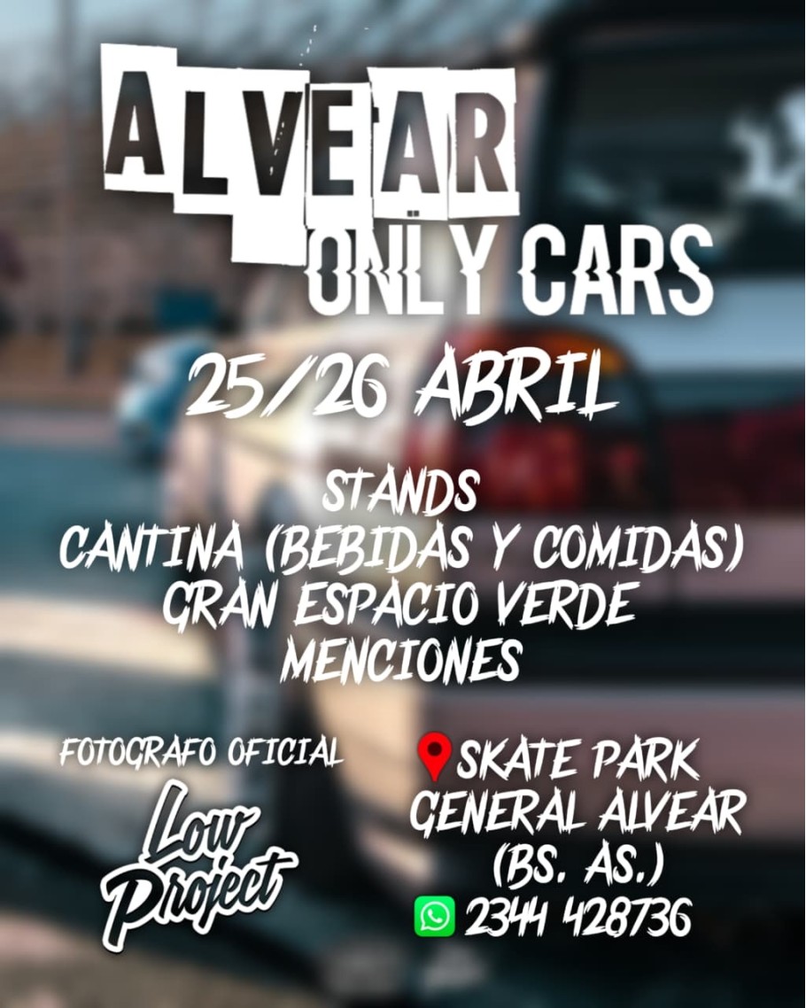 Este fin de semana, se realizará el Alvear Only Cars en nuestra ciudad. Será en la avenida 9 de Julio e Hipólito Yrigoyeny habrá Stand, Cantina con venta de bebidas y comidas y gran espacio verde. Sábado de17 a 02 horas y domingo de 10 a 18 horas.