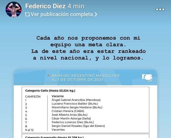 El púgil profesional Federico Diez, fue ubicado en la 7ma posición de la categoría gallo, lo que una de sus metas para este 2025. "Cada año nos proponemos una meta clara con mi equipo, la de este año, era estar rankeado a nivel nacional y lo logramos", escribió en sus redes sociales.