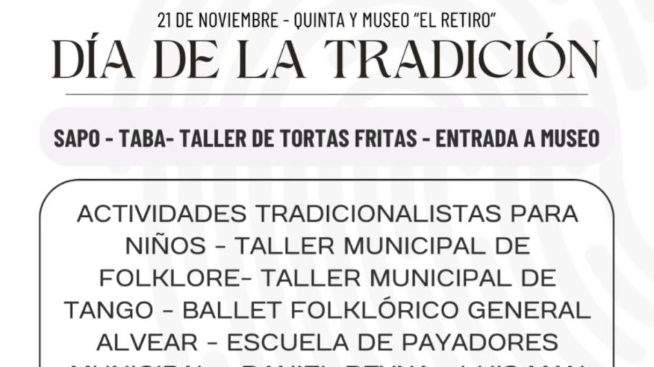Durante la jornada se realizarán juegos típicos como sapo y taba, un taller de tortas fritas y el acceso libre al museo. También habrá actividades tradicionalistas para niños, a cargo del Taller Municipal de Folklore, el Taller Municipal de Tango, el Ballet Folklórico General Alvear y la Escuela de Payadores Municipal.