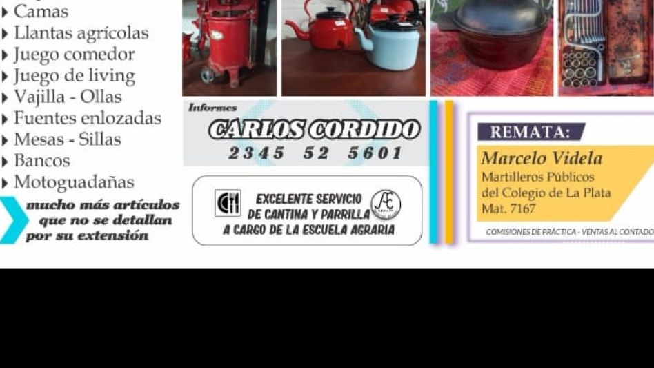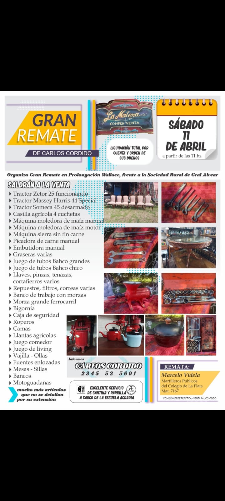 El sábado 11 de abril desde las 11 horas, Carlitos Cordido realizará un Gran Remate por liquidación total por cuenta y orden de sus dueños. Será Será en Prolongación Wallace, frente a la Sociedad Rural de General Alvear. Habrá excelente servicio de cantina y parrilla a cargo de la Escuela Agraria