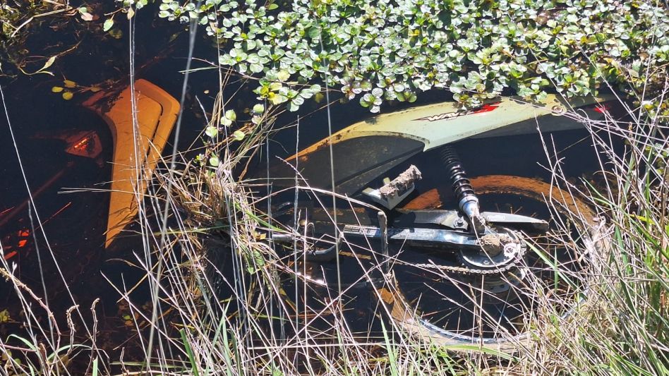 El procedimiento se realizó con móviles policiales, personal a pie y mediante la utilización del dron del CPR, logrando hallar el motovehículo en el interior de una cuneta, en la geolocalización -36.03490; -60.05494, encontrándose sumergido en el agua.