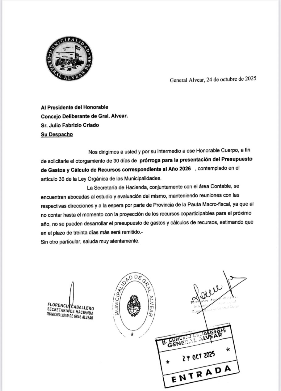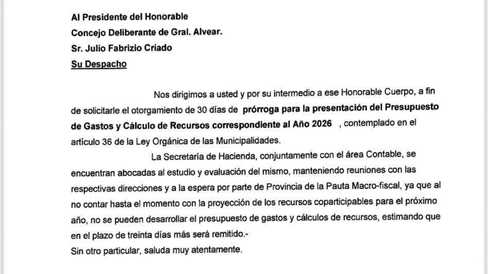 Nos dirigimos a usted y por su intermedio a ese Honorable Cuerpo, a fin de solicitarle el otorgamiento de 30 días de prórroga para la presentación del Presupuesto de Gastos y Cálculo de Recursos correspondiente al Año 2026, contemplado en el artículo 36 de la Ley Orgánica de las Municipalidades.