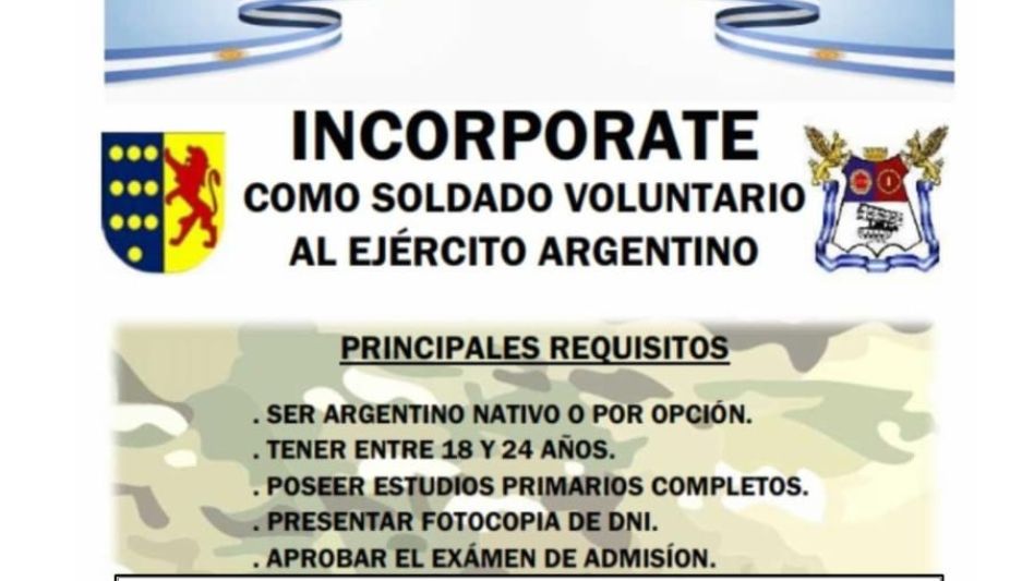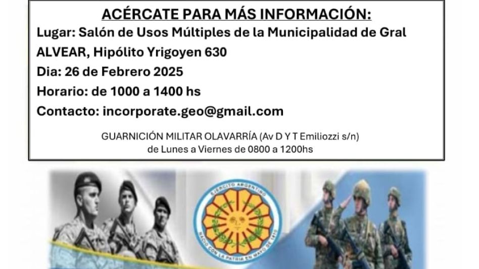La Municipalidad de General invita a los vecinos a concurrir a la charla informativa de incorporación al Ejército Argentino que se llevara a cabo el día miércoles 26 de febrero, en el horario de 10:00 a 14:00 horas.