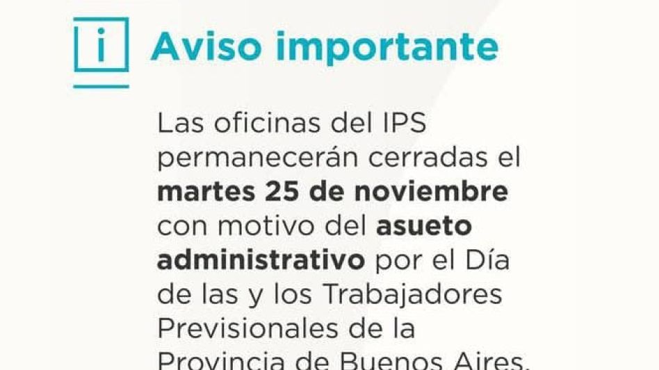 Cabe aclarar que el miércoles 26 de noviembre todas las oficinas del IPS retomarán con normalidad sus actividades.