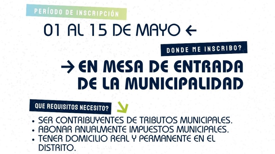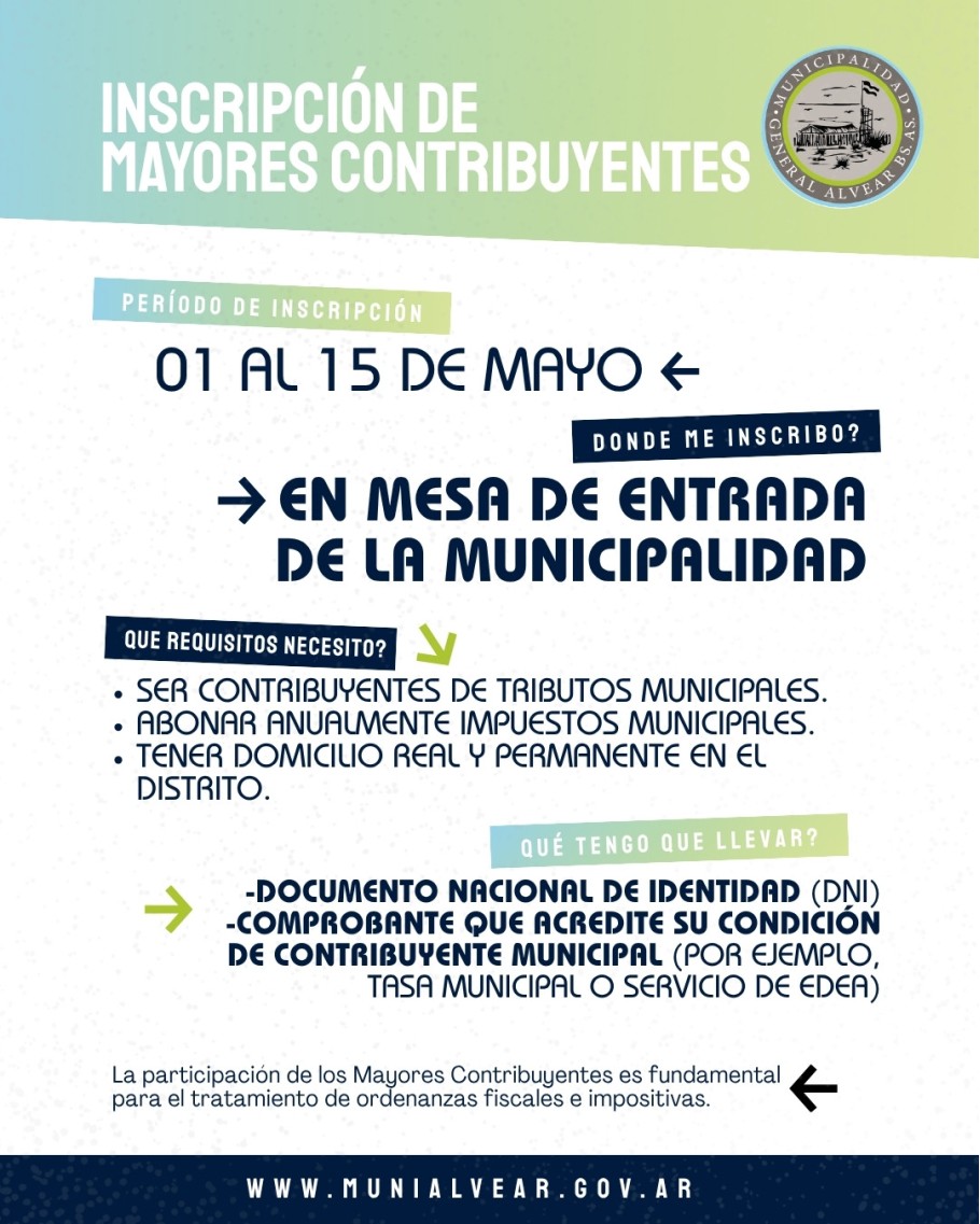 La Municipalidad informa a la comunidad que se encuentra abierta la inscripción para conformar el Registro de Mayores Contribuyentes, en el marco de lo establecido por la Ley Orgánica de las Municipalidades de la Provincia de Buenos Aires.