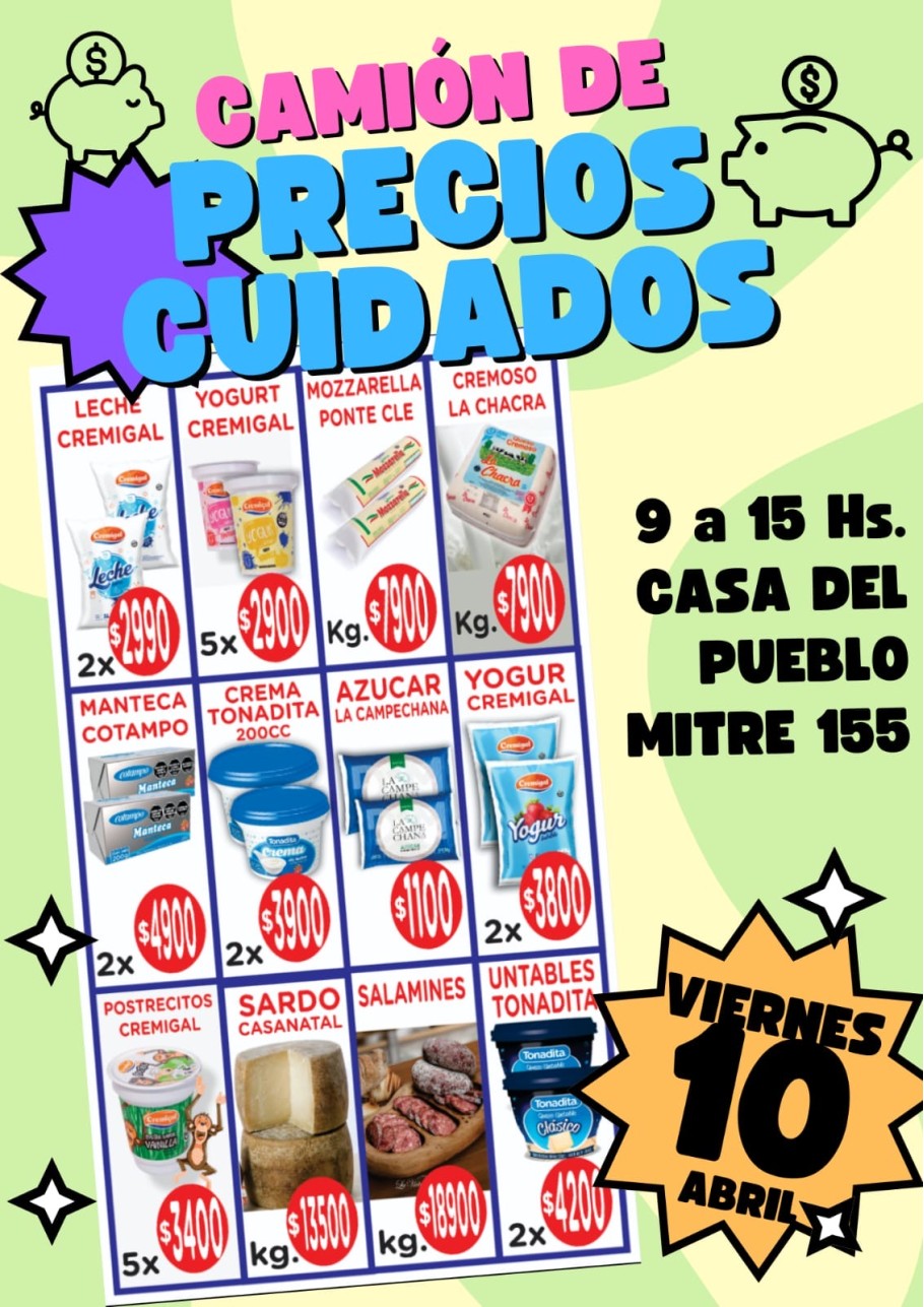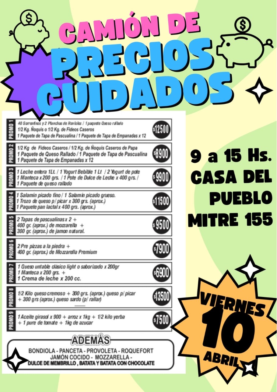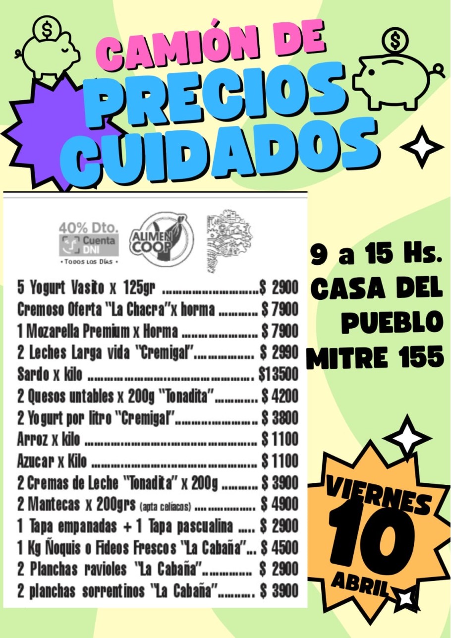 Este viernes 10 de abril llegará a General Alvear el Camión de Precios Cuidados, que se instalará de 9 a 15 horas en Mitre 155, en la Casa del Pueblo, con distintas promociones de alimentos a precios accesibles.