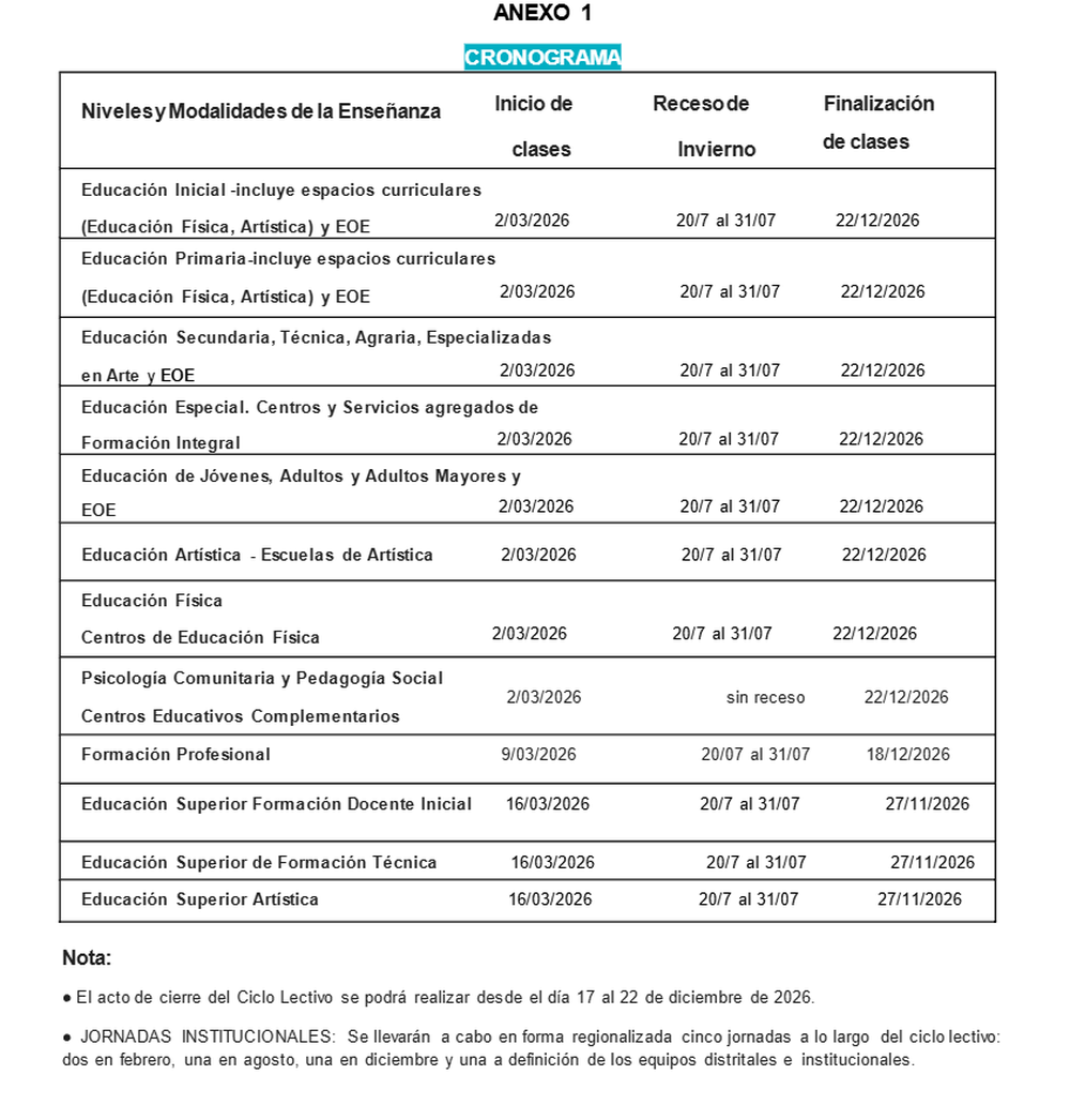 La resolución también fija la realización de cinco jornadas institucionales a lo largo del ciclo lectivo: dos en febrero, una en agosto, una en diciembre y una adicional a definir por los equipos distritales e institucionales. Asimismo, se establece que el acto de cierre del ciclo lectivo podrá realizarse entre el 17 y el 22 de diciembre.
