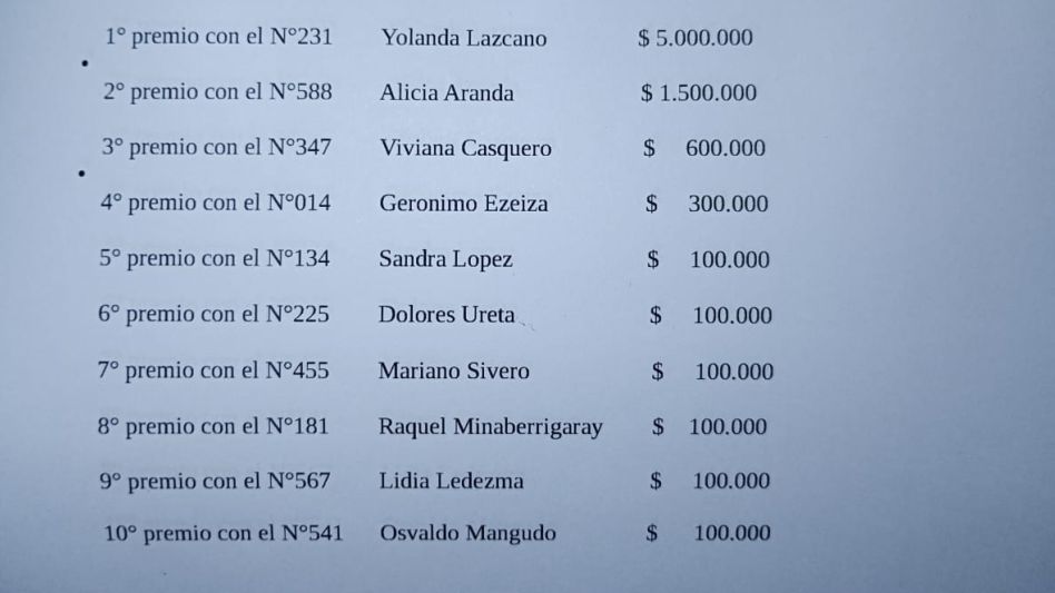 1° premio con el N°231: Yolanda Lazcano - $ 5.000.000