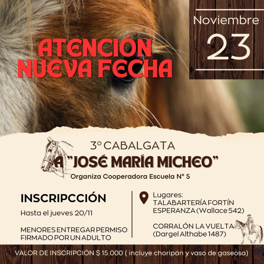 Debido a que el predio está bajo el agua se reprogramó para el 23 de noviembre la Cabalgata hacia Micheo. La inscripción es hasta el día 20 de noviembre