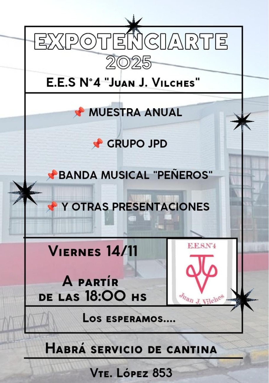 La E.E.S. N°4 "Juan J. Vilches" te invita a disfrutar de su muestra anual, donde nuestros estudiantes compartirán todo el talento y el trabajo desarrollado durante el año.