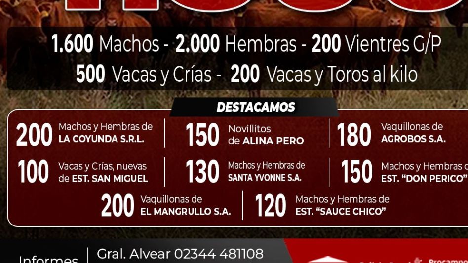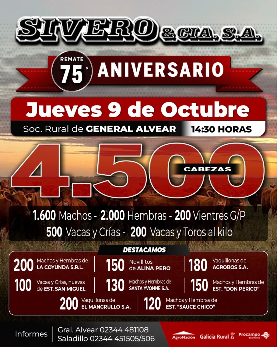 Este jueves 9 de octubre, Sivero y Cía realizará su remate 75 aniversario. Será en las instalaciones de la Sociedad Rural de General Alvear desde las 14.30 horas. 4500 vacunos anotados a la fecha.