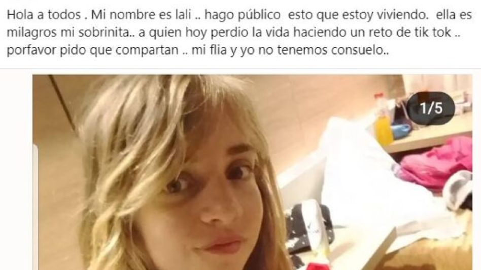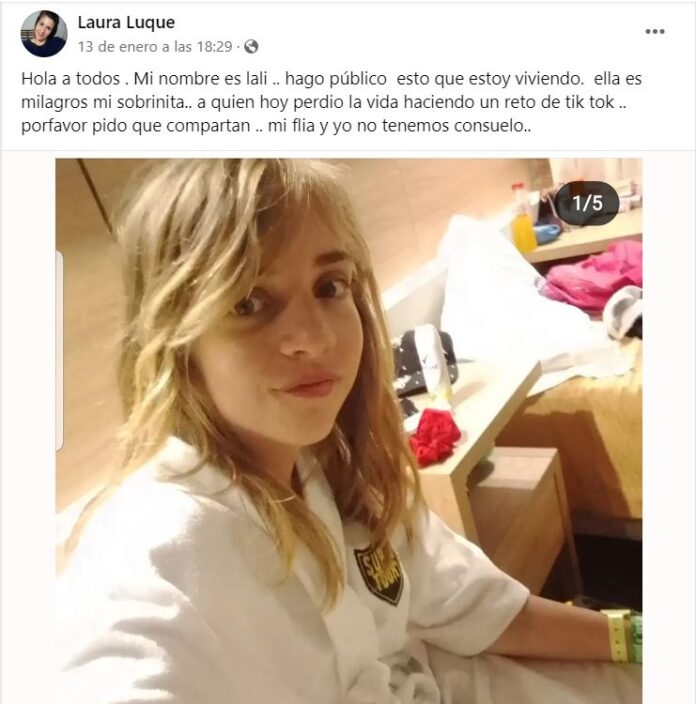 "Ella es Milagro, mi sobrinita. Perdió la vida haciendo un reto de Tik-Tok. Por favor, compartan. Mi familia y yo no tenemos consuelo" dice el mensaje que subió a Facebook Laura Luque, la tía de la víctima. Aclaró, además, que la niña fue alentada por unas amigas y en el marco de ese desafío, Milagros se ahorcó.